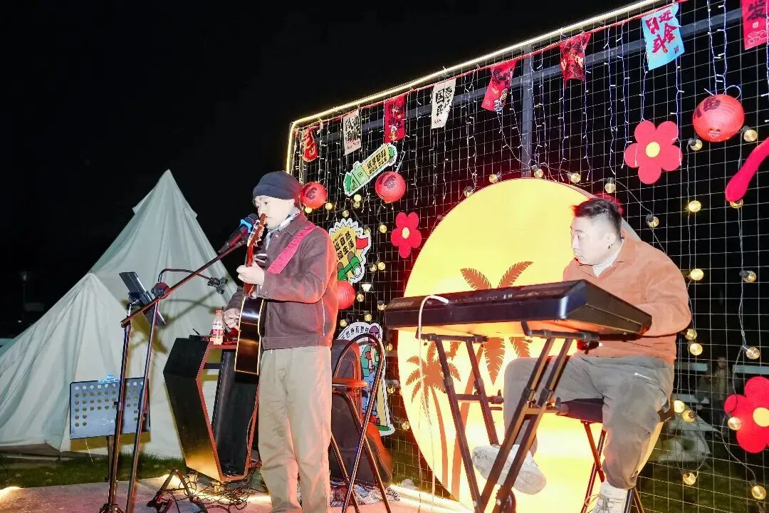 傍晚时分,露营区化身为热闹的「年味市集」。这里有各式传统手工艺品、地道年货小吃,驻唱歌手用民谣旋律让你慢慢融入其中,这里是完美的“热身”起点。