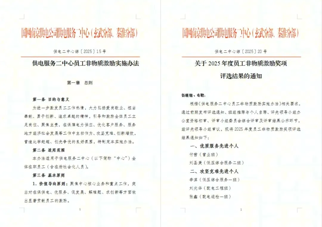 为打破单纯依赖物质激励的局限,构建更加立体、更加丰富、更宽平台的价值认同与精神激励体系。南京公司党委于2025年打造了“345”非物质激励体系,并配套下发《非物质激励工具箱》。在此指引下,供服二中心结合实际制定了《员工非物质激励实施办法》,让非物质激励与物质激励、职业发展激励有机结合,以荣誉表彰、成长赋能、价值认同为核心,让每一位努力奋斗的员工都能被看见、被肯定、被尊重。
