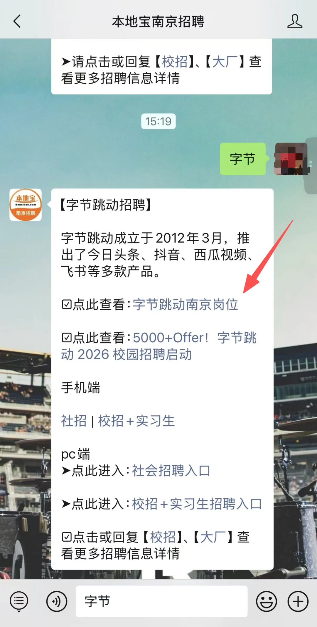 进入【本地宝南京招聘】公众号,对话框回复关键词【字节】,即可快速进入字节招聘报名入口,查看全部招聘岗位要求等信息。