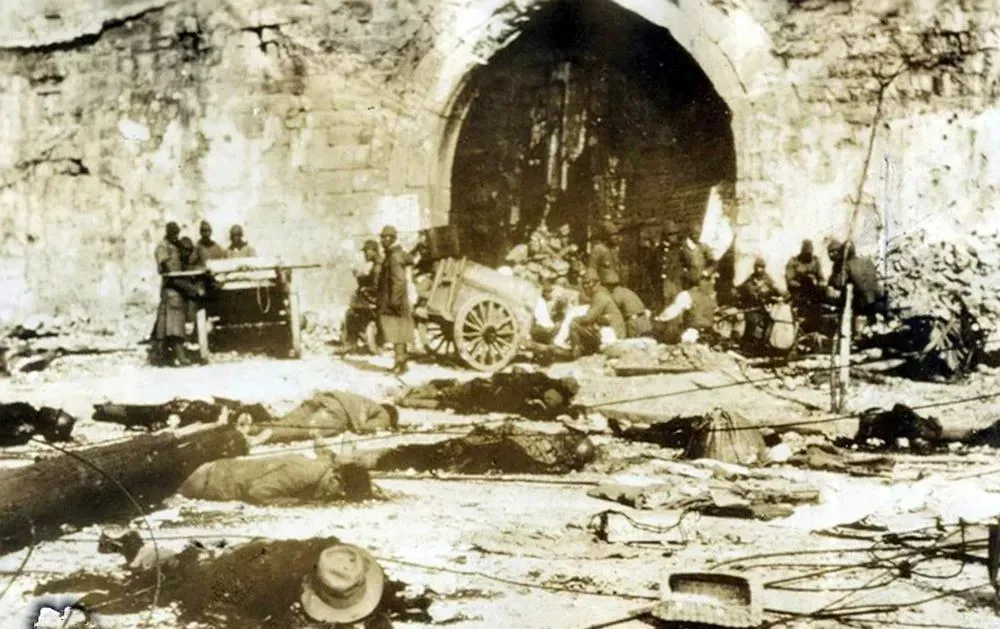 队伍前面由已经被日本兵缴械的巡警开路,后头则是日本兵的马队押阵,沿途全是死人,男女老幼都有,甚至包括孕妇。沿街的房屋内,不时传出女人凄惨的哭喊声,以及日本兵的笑声,至于里面发生了什么事,每个人都很清楚,但也仅仅是敢怒不敢言,只在心底默默念佛,希望佛祖保佑自家的女人不要被日本兵抓走。