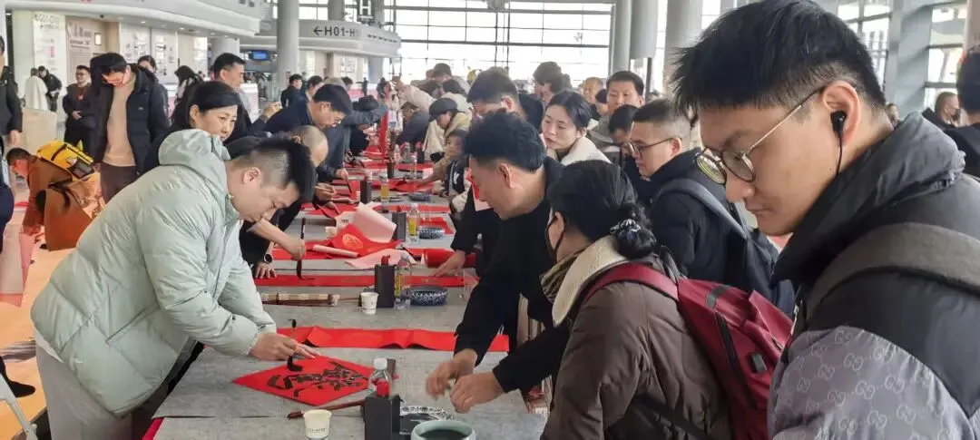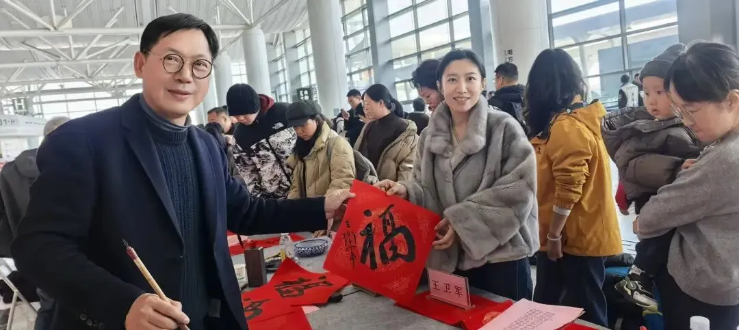 活动现场,他们将亲手书写的“福”字和春联赠予往来旅客,无论归乡还是远行,这一纸祝福都为新年旅途增添了一份平安与喜乐。铺展的红宣、饱蘸的浓墨、沉实的笔锋,交织成一幅生动的年俗画卷。书画家们凝神运笔,或行云流水书联对,或匠心独运绘“福”字,楷书端庄、行书灵动、草书洒脱,各具神采。“福满门庭春入户,喜盈岁月乐盈心”“马年行大运,福至万事兴”等寓意吉祥的联句,与形态各异的“福”字一道,引得旅客纷纷驻足、排队迎福。不少家庭带着孩子一同参与,在墨香中感知书法之美,也将这份来自江苏的春意悉心收进行囊。