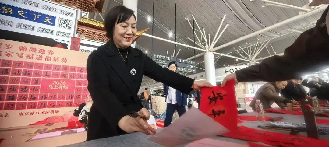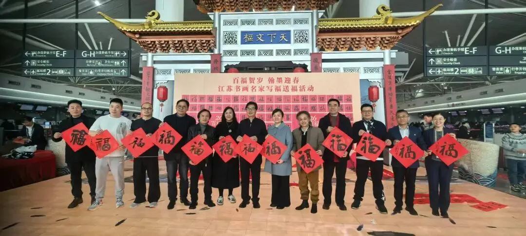 2026年2月13日,南京禄口国际机场航站楼内暖意融融,一面由江苏书画名家共同书写的“百福墙”格外醒目,“百福墙”下,一场以“百福贺岁 翰墨迎春”为主题的写福送福活动在这里温情呈现。多位书画名家现场挥毫泼墨,为步履匆匆的春运旅客送上手写春联与“福”字,让传统笔墨的温度与新年的祝福,伴飞每一程归途。