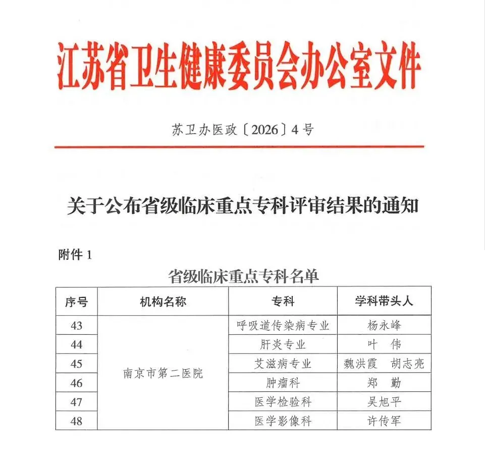 近日,江苏省卫生健康委员会正式公布了省级临床重点专科评审结果,南京市第二医院艾滋病专科顺利通过评审,标志着医院专科建设水平迈上新台阶,高质量发展再结硕果。