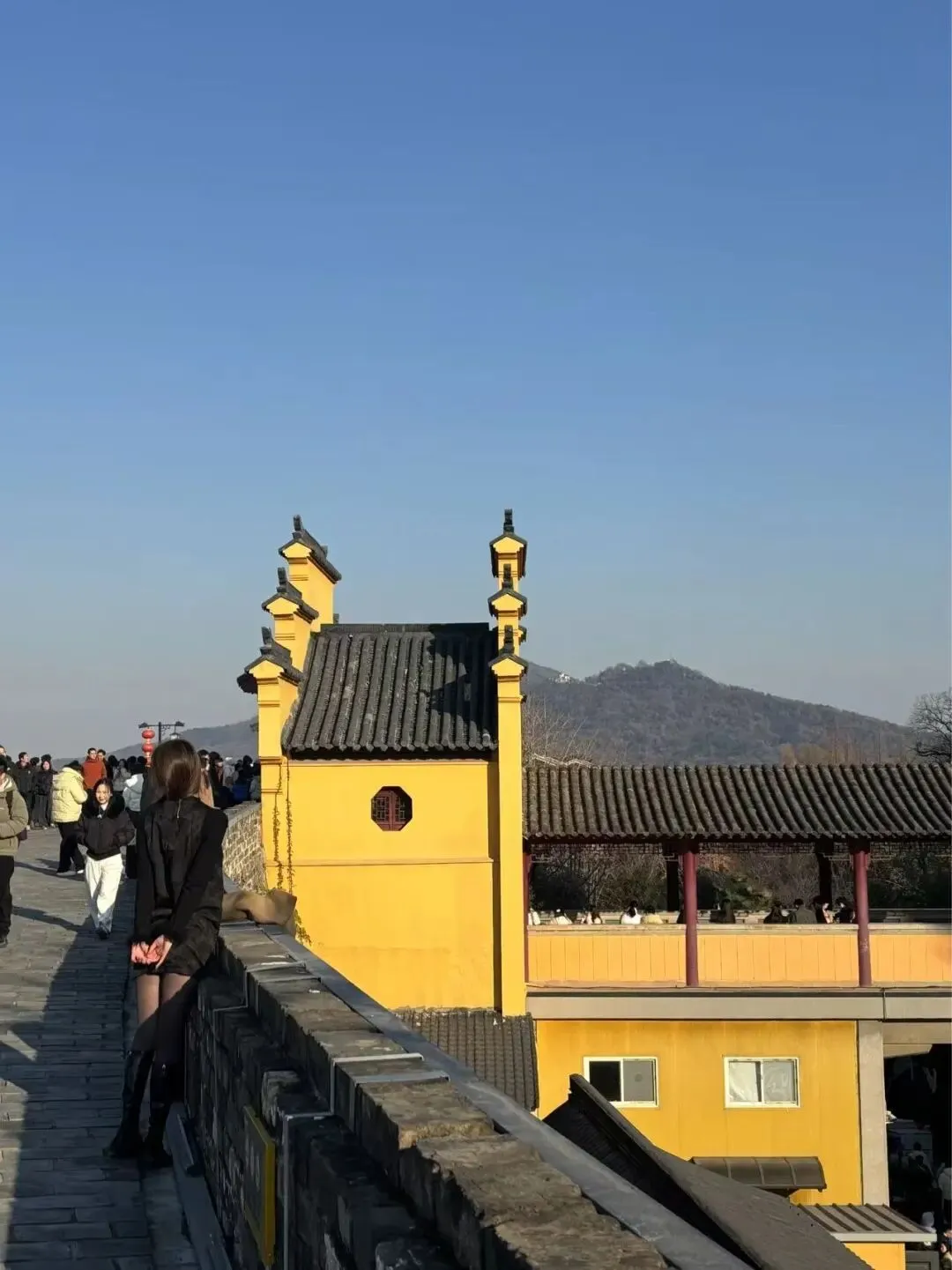 明城墙上眺望,左侧是玄武湖——如今不再是水师演练场地,而是家庭团聚游船的游乐场,右侧鸡鸣寺的黄墙黛瓦静静伫立,烟火缭绕。
