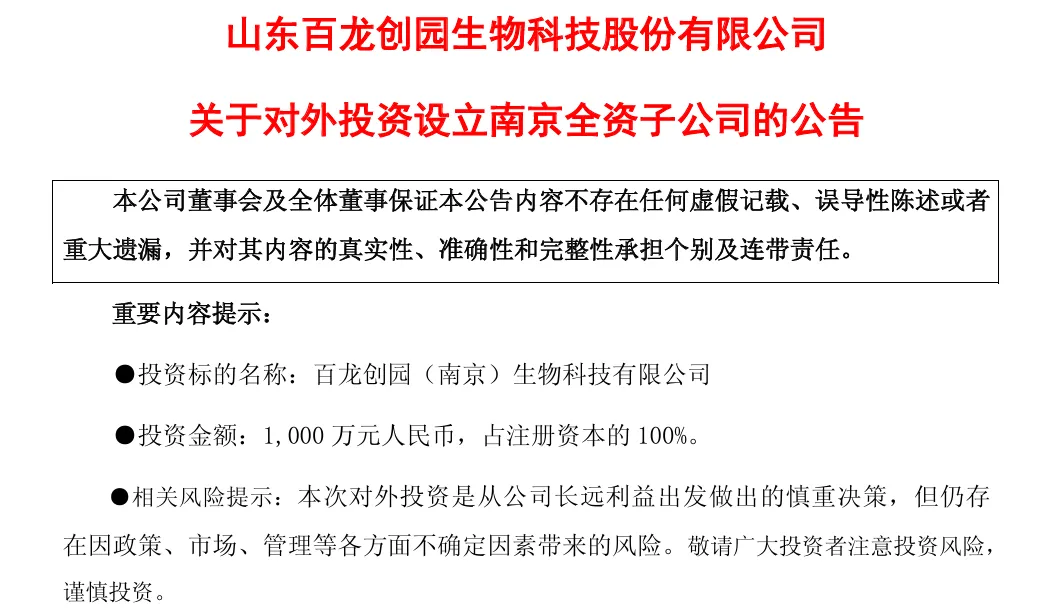 2月11日,百龙创园(证券代码:605016)公告称,公司基于发展战略规划及经营发展需要,以自有资金1000万元,在南京投资设立全资子公司百龙创园(南京)生物科技有限公司(以下简称“南京百龙”),公司直接持有南京百龙100%的股份。