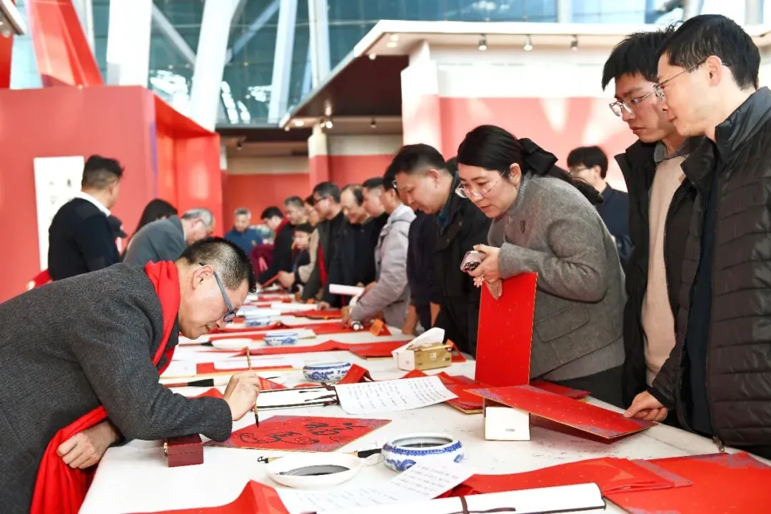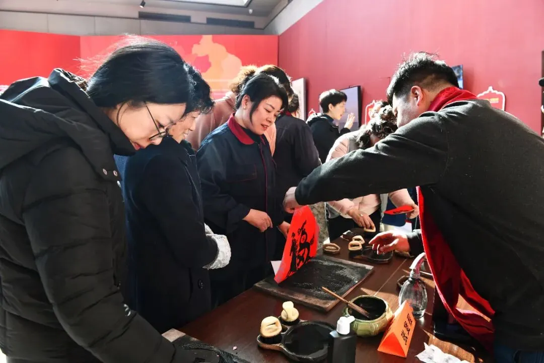 活动现场举办了艺术家写春联送祝福、送吉祥,木刻年画、非遗拓印公教等一系列迎春文艺惠民活动。展厅内还贴心设置寄语留言、春联创作、工艺体验等互动场景,为艺术与大众搭建起桥梁,让观众从旁观者变为参与者、共鸣者,让“艺聚”底蕴滋养出更具活力与温度的文化沃土。