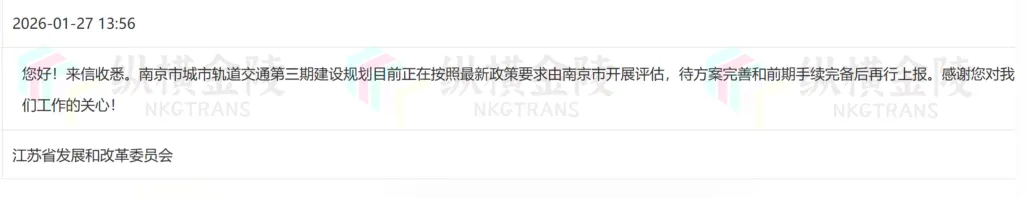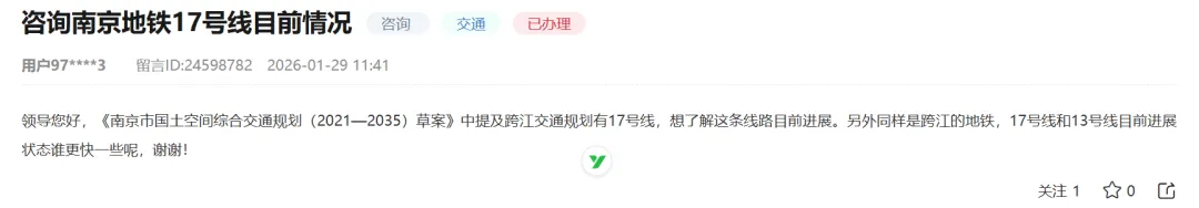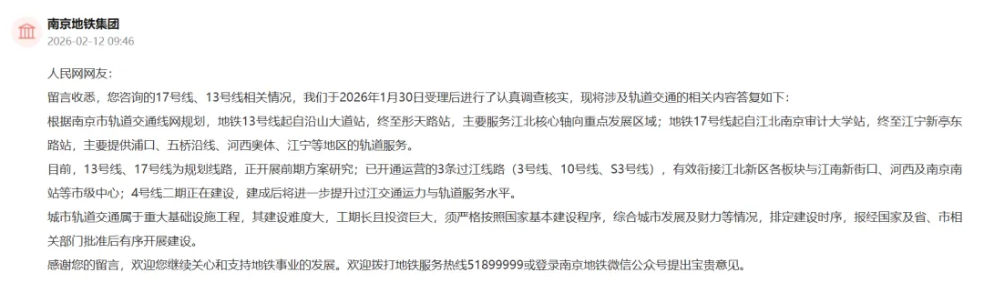 最近,全国多座城市先后官宣“地铁审批收紧、暂缓建设”。与此同时,南京地铁三期计划传出“重新评估、重新上报”的传闻。不少网友关心,南京两条跨江地铁17、13号线有望进入三期计划吗?近期,人民网领导留言板上一位网友留言咨询:“《南京市国土空间综合交通规划(2021—2035)草案》中提及跨江交通规划有17号线,想了解这条线路目前进展。另外同样是跨江的地铁,17号线和13号线目前进展状态谁更快一些呢。”对此,南京地铁集团做出了回应,内容涵盖三点:
