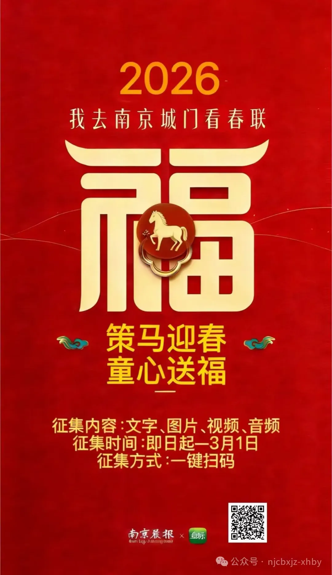 今天起,南京晨报面向全市中小学生发起一个温暖的征集“策马迎春·童心送福——2026,我去南京城门看春联”。