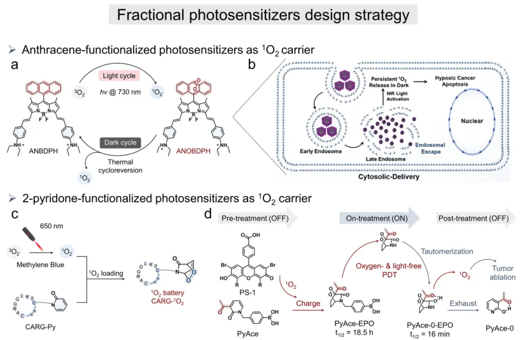 传统II型光动力疗法(PDT)的治疗效果从根本上受限于其对氧气的依赖性,导致其在缺氧肿瘤微环境(TME)中疗效不佳。为突破这一局限,暗可持续分次光动力疗法(fractional PDT)所用光敏剂的开发引起广泛关注——这类光敏剂能够在不依赖持续光照的条件下存储并释放单线态氧(¹O₂)。在此背景下,内过氧化物整合光敏剂作为一类新型智能分子构建体,通过将¹O₂捕获单元与光敏单元协同耦合,实现了¹O₂的可逆捕获和热触发释放,从而将细胞毒性效应延伸至光照窗口之外。进一步研究开发出具有内体逃逸能力的质子响应型可切换¹O₂纳米捕获系统(图4a)。基于蒽的分次光敏剂ANBDP在酸性细胞内区间发生质子化形成ANBDPH,该过程通过灭活电荷转移(CT)态显著增强¹O₂生成(图4b)。在730 nm光照下,ANBDPH高效产生¹O₂,随即被蒽单元捕获形成稳定的内过氧化物中间体(ANOBDPH)。值得注意的是,ANOBDPH通过热环逆反应释放耐缺氧¹O₂,实现了无需持续照明的暗可持续PDT,有效延长治疗时间窗口。