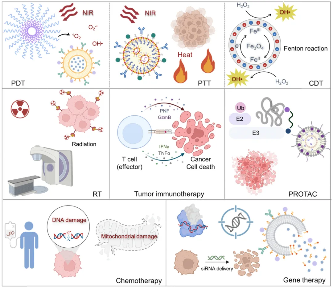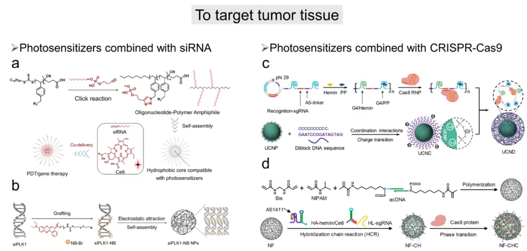 基因调控策略(尤其是小干扰RNA技术)因其能高特异性沉默疾病相关基因,已成为癌症治疗的重要工具。但未经修饰的siRNA存在细胞摄取率低、易被酶降解等问题。为突破这些局限,病毒载体、阳离子聚合物、脂质体及多孔纳米颗粒等多种纳米载体被用于提升递送效率和系统稳定性。典型代表PSNA@Ce6@siMCT1纳米平台将光敏剂Ce6封装于聚合物球形核酸疏水核内,表面杂交抗MCT1 siRNA(图7a),显著增强siRNA稳定性和摄取效率。在光照下,Ce6通过光化学内化效应引发溶酶体逃逸,促进siRNA转染并沉默MCT1表达,从而缓解肿瘤缺氧并增强Ce6的光动力疗效。为降低聚合物载体的生物安全性风险,研究人员开发出智能无载体siRNA递送系统:通过静电作用将阳离子硫代尼罗蓝光敏剂NB-Br与靶向PLK1的siRNA连接形成siPLK1-NB纳米颗粒(图7b)。该颗粒被肿瘤细胞溶酶体摄取后,光诱导产生的活性氧可破坏溶酶体膜,释放siRNA并有效沉默PLK1基因,最终诱导细胞凋亡。
