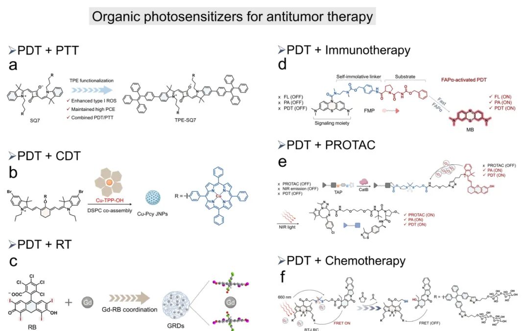 有机光敏剂在生物医学的治疗与诊断领域展现出卓越的多功能性。PDT作为一种非侵入性治疗方式,可与手术、化疗及放疗等传统策略协同应用(图9)。除治疗应用外,有机光敏剂还可利用辐射衰变过程作为荧光探针,在特定波长激发下实现实时成像。此外,通过非辐射衰变途径,某些有机光敏剂能将吸收的光能转化为局部热量,产生可用于光声成像的可检测超声信号。具有余辉发光特性的有机光敏剂能在照射后维持长时间信号持续,为实时及长期光热诊疗应用提供重要潜力。