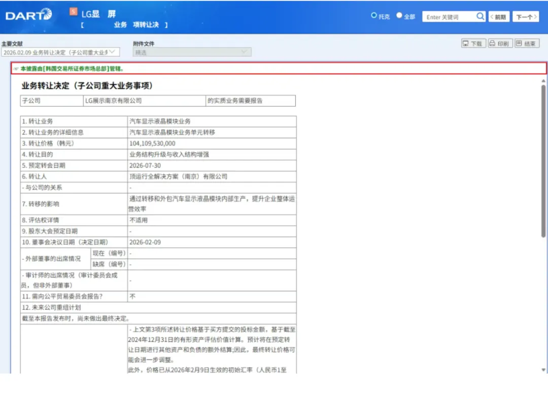 2月9日,韩国显示面板制造商LG Display(下称LGD)正式对外披露,已签署协议将旗下乐金显示(南京)有限公司的车载LCD模组业务转让给韩国显示零部件企业Toprun Total Solution的南京法人(TRCN),交易金额为4.915亿元人民币,预计交割日期为2025年7月30日。