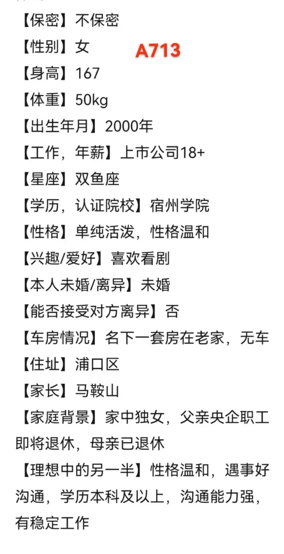 这是一个浮躁的时代,也是一个认识人成本极低的时代,无效的人和事占据太多的时间,骗子、约炮、理财销售等等让我们产生焦虑、内耗,为了帮助大家节约时间,相亲宝公众号发帖人不公布联系方式,我们红娘负责过滤一些不靠谱的人,专门进行验证核实。提示大家:相亲急切的心情可以理解,但相亲过程中不要有任何金钱往来,切记切记。精准一对一推荐介绍,唯一线下门店地址:秦淮区大行宫长安国际2307。