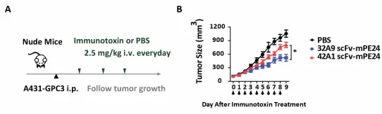 图1:32A9 scFv-mPE24 和 42A1 scFv-mPE24 抗肿瘤活性评估。