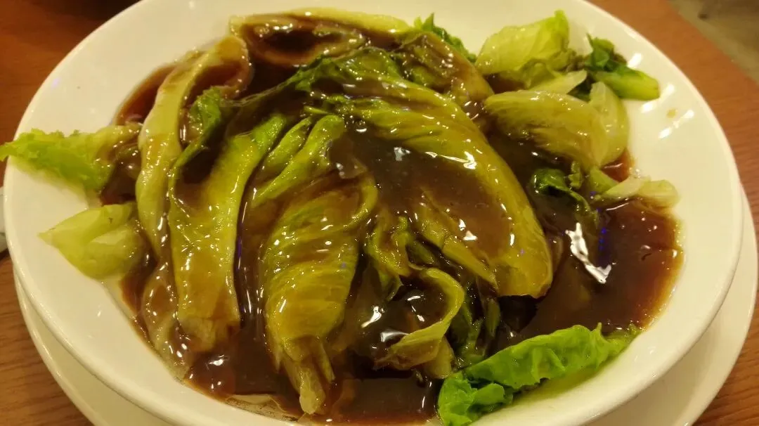 蚝油生菜,去他家的前两天都没怎么吃绿叶菜,既然到饭店了么就点上一个绿叶菜。一样的问题,下手重了些。
