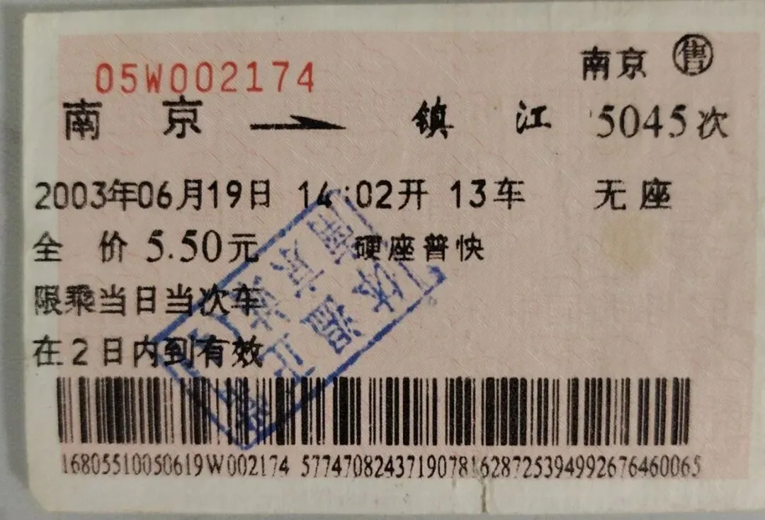 2.2003年,南京-镇江火车票,特殊蓝印章。