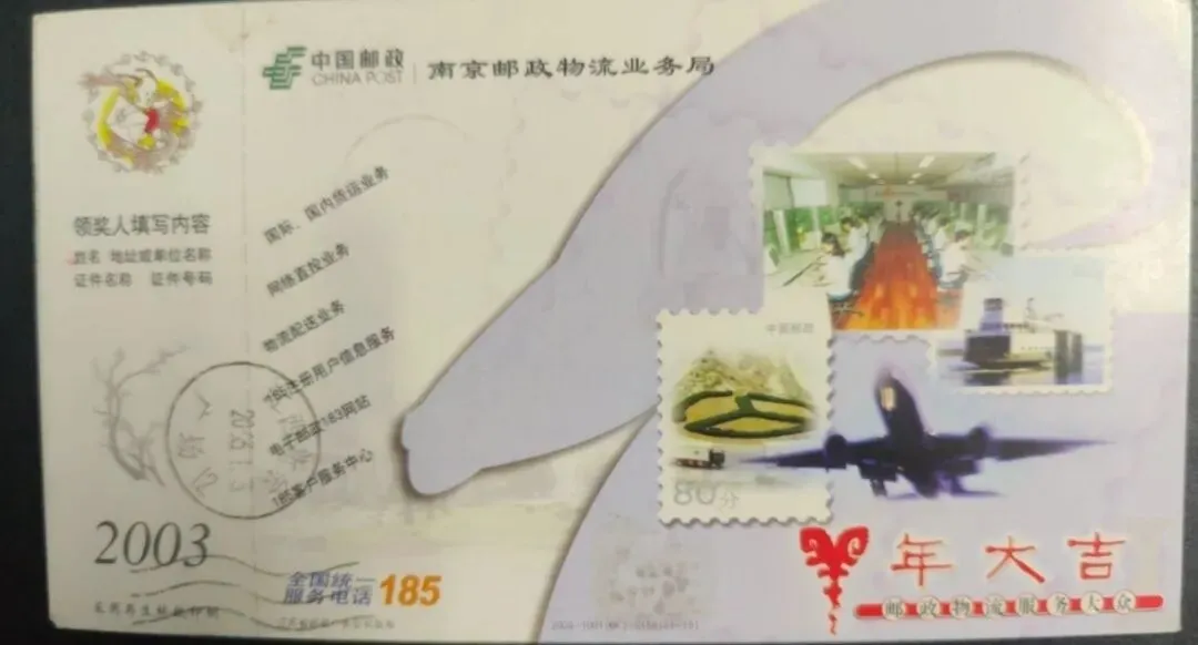 4.2003年,中国邮票飞机轮船南京邮政物流业务局明信片。
