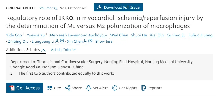 论文题为“Regulatory role of IKKɑ in myocardial ischemia/reperfusion injury by the determination of M1 versus M2 polarization of macrophages”(巨噬细胞M1 / M2极化对IKK在心肌缺血/再灌注损伤中的调节作用)