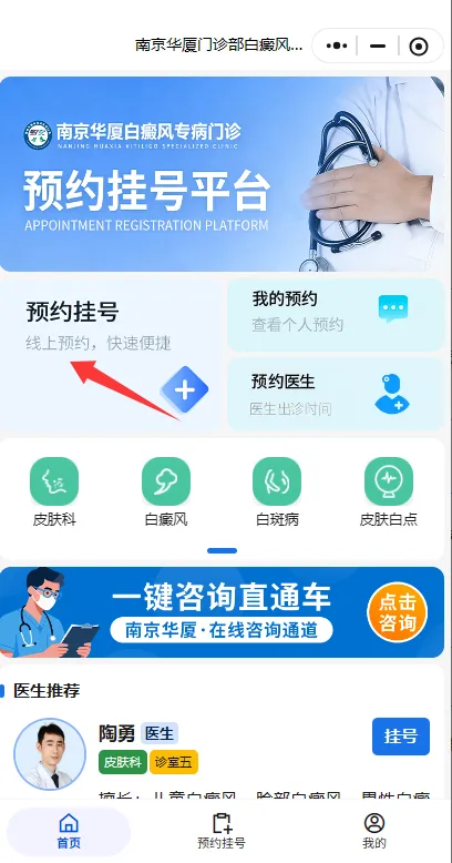 点击关注“南京华厦门诊部白癜风挂号中心”小程序,并且点击菜单栏中的“预约挂号”进入挂号页面。