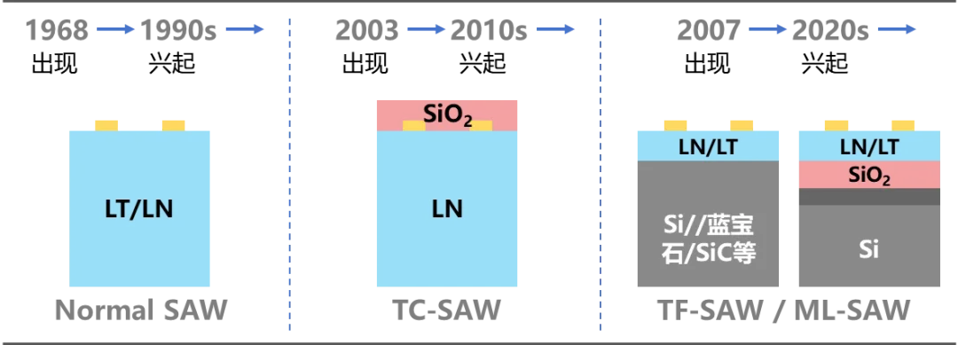 TF-SAW器件采用亚微米或纳米级的LiNbO3、LiTaO3、AlScN薄膜,搭载在单层或多层衬底上,因此也称作多层薄膜声表面波器件(ML-SAW)。TF-SAW衬底材料包括二氧化硅、硅、蓝宝石、碳化硅或金刚石。这种材料体系不仅实现了更高的工作频率和更低的损耗,还支持更多样化的声学模式。传统的SAW器件主要依赖瑞利(Rayleigh)模式,而TF-SAW器件则可广泛采用勒夫(Love)模式。Love模式以剪切模量为主导,产生水平极化的剪切波,能够在薄膜结构中有效减小垂直能量泄漏并最大化波的局域化。因此,基于Love模式的SAW器件展现出了更高的机电耦合系数和更低的辐射损耗,这为声学谐振器、宽带滤波器及其它相关器件的发展提供了有力支持。图1展示了SAW器件的演变历程。