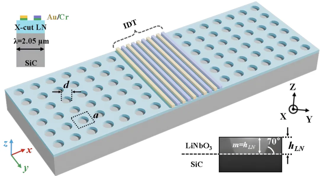 南京大学余思远、陈延峰研究组提出了一种基于铌酸锂薄膜/碳化硅基底的SAW声子晶体。选择碳化硅作为高速基底,主要是因为其具有高声速(12500 m/s)、高热导率(约490 W·m⁻¹·K⁻¹)和低Akhiezer机械阻尼等关键优势,这些特性有助于高频声表面波的激励,同时能够有效抑制和局域Love模式声表面波,从而展现出提升传统微波声学器件性能的优异潜力。如图2所示,微孔型声子晶体被置于叉指换能器两侧,替代了传统的金属指条反射栅。与同尺寸的传统谐振器相比,这种新型设计能够实现更高的品质因子(Q)和优值(FoM),且不损害其它性能。