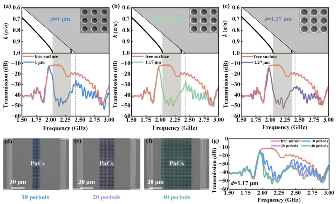 在铌酸锂表面上,研究组利用电感耦合等离子体-反应离子刻蚀(ICP-RIE)技术,在铌酸锂薄膜上构造了微孔型声子晶体,并通过单向换能器激发和接收Love波(波的传播方向平行于声子晶体Γ-X方向),进而构建了声子晶体传输线,研究了圆孔尺寸和声子晶体层数对2GHz Love波抑制效果的影响,如图3和图4所示。