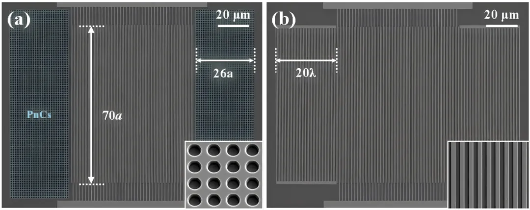 研究组通过将传统谐振器(CR)中的布拉格反射栅替换为相同长度的声子晶体,构建了声子晶体谐振器(PnCR),如图6所示。该谐振器的孔径为70μm,反射区域由沿传播方向的26层声子晶体反射栅组成,总长度为39μm。两种谐振器均包含40对叉指换能器。传统谐振器的布拉格反射栅由与叉指换能器周期相同的金属指条构成,其长度为20个电极周期(41μm)。