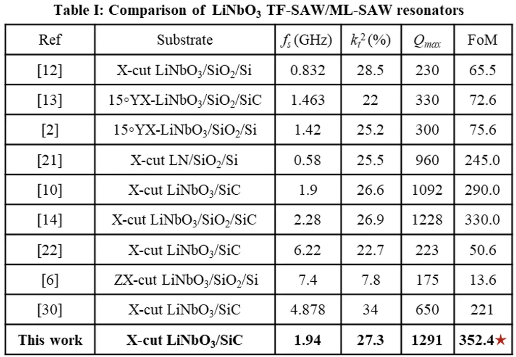 通过对比两种谐振器,研究组在声子晶体谐振器中实现了Q值提升25.7%(达到1291),同时在2GHz以上频率下保持了27.3%的高机电耦合系数。这种组合实现了破纪录的优值(FoM值)352.4,并且没有引入明显的杂模,如图7所示。研究结果展示了声子晶体在推动高性能、小型化SAW器件方面的潜力。