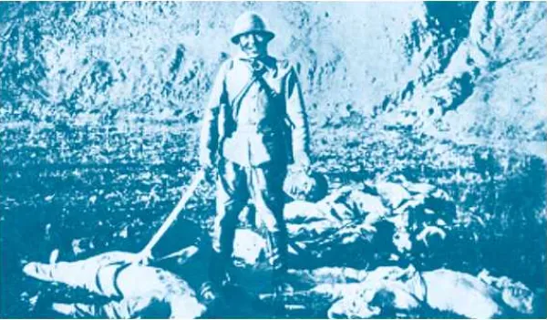 17日上午凌晨,三百多个日本宪兵来收容所,气势汹汹,除广场布满警戒外,四周还架起机关枪瞄准广场。宪兵队长向翻译叽咕了一阵后,翻译大声说:“所有男青壮年通通到广场来。”宪兵还到各间屋用刺刀驱赶,共有三千多人,有一个害怕不敢出来的青年,宪兵队长咧嘴叽里呱啦地大叫一声,抽出所佩军刀,向那青年上胸部猛力捅穿背心,军刀抽出时,那青年鲜血直喷在粉墙上倒地死去。一妇女见状惊叫一声昏倒,日寇队长将带血的刀在青年身上擦拭,哈哈大笑。