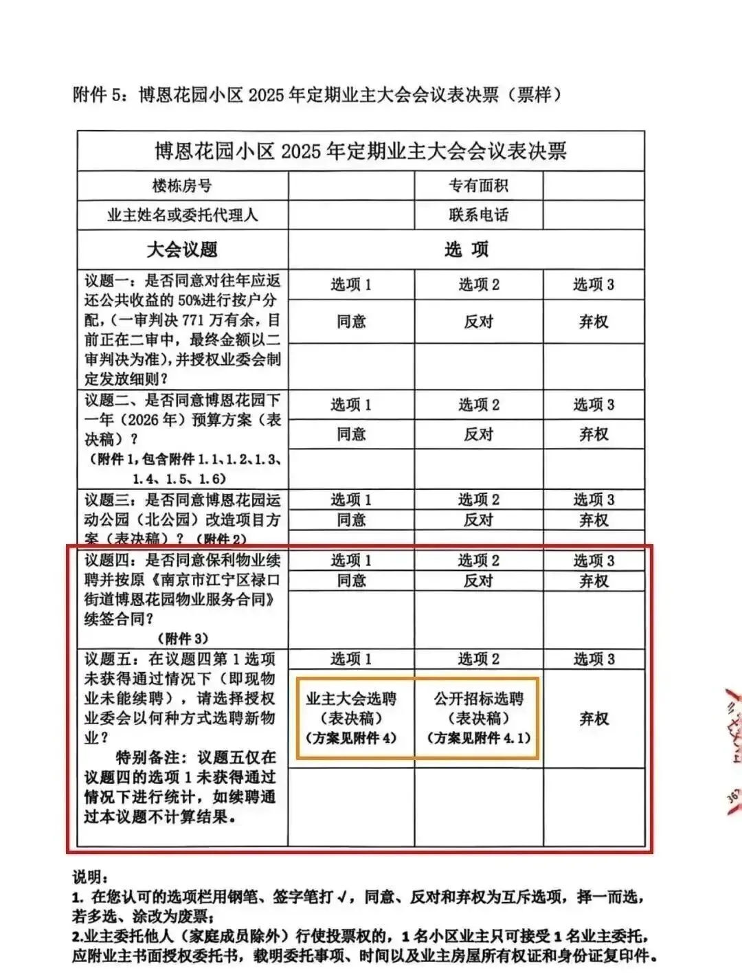 当协商无法破局,业委会再次将决定权交还业主。2025年11月至2026年1月,涵盖五大议题的业主大会正式启动,其中“是否续聘保利物业”“公共收益分红”成为最受关注的焦点。7000户业主的投票,既是对当前物业服务的“大考”,也是对业主自治权利的再次践行。