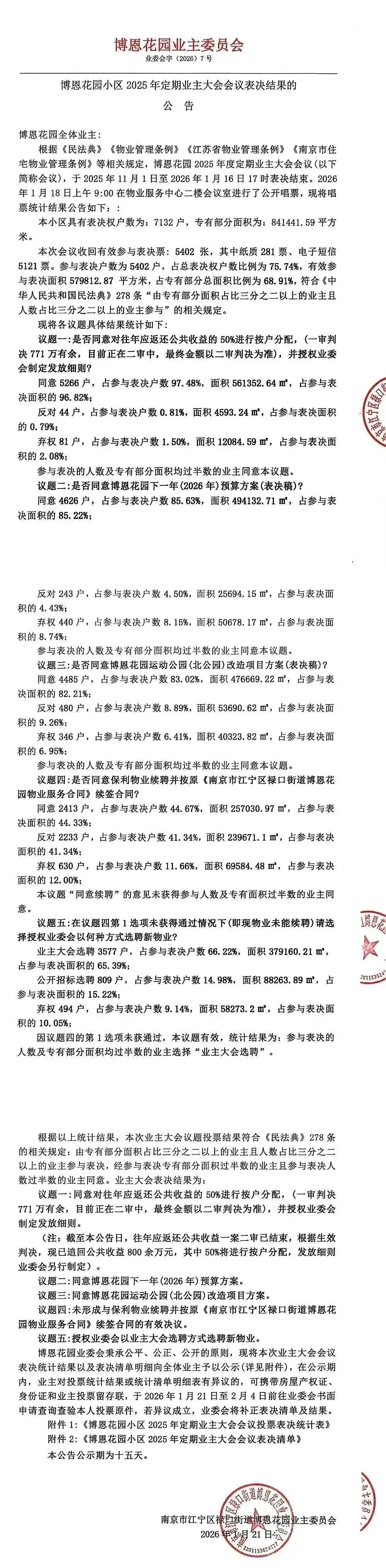 在南京江宁禄口街道,建筑面积超100万方、住户逾7000户的博恩花园(又名翠屏城),始终是楼市与业主自治领域的“流量焦点”。从2023年怒斩盘踞十年的老物业,到2025年追回771万公共收益震惊业界,这个超级大盘的每一步动作都牵动着1.5万常住人口的神经。而2026年1月21日业主大会的表决结果,更是将事件推向新的高潮——刚服务两年多的保利物业未获续聘,公共收益50%按户分红的方案高票通过,一场关于业主权利、物业履约与小区治理的硬核实践,正在这座超级大盘激烈上演。