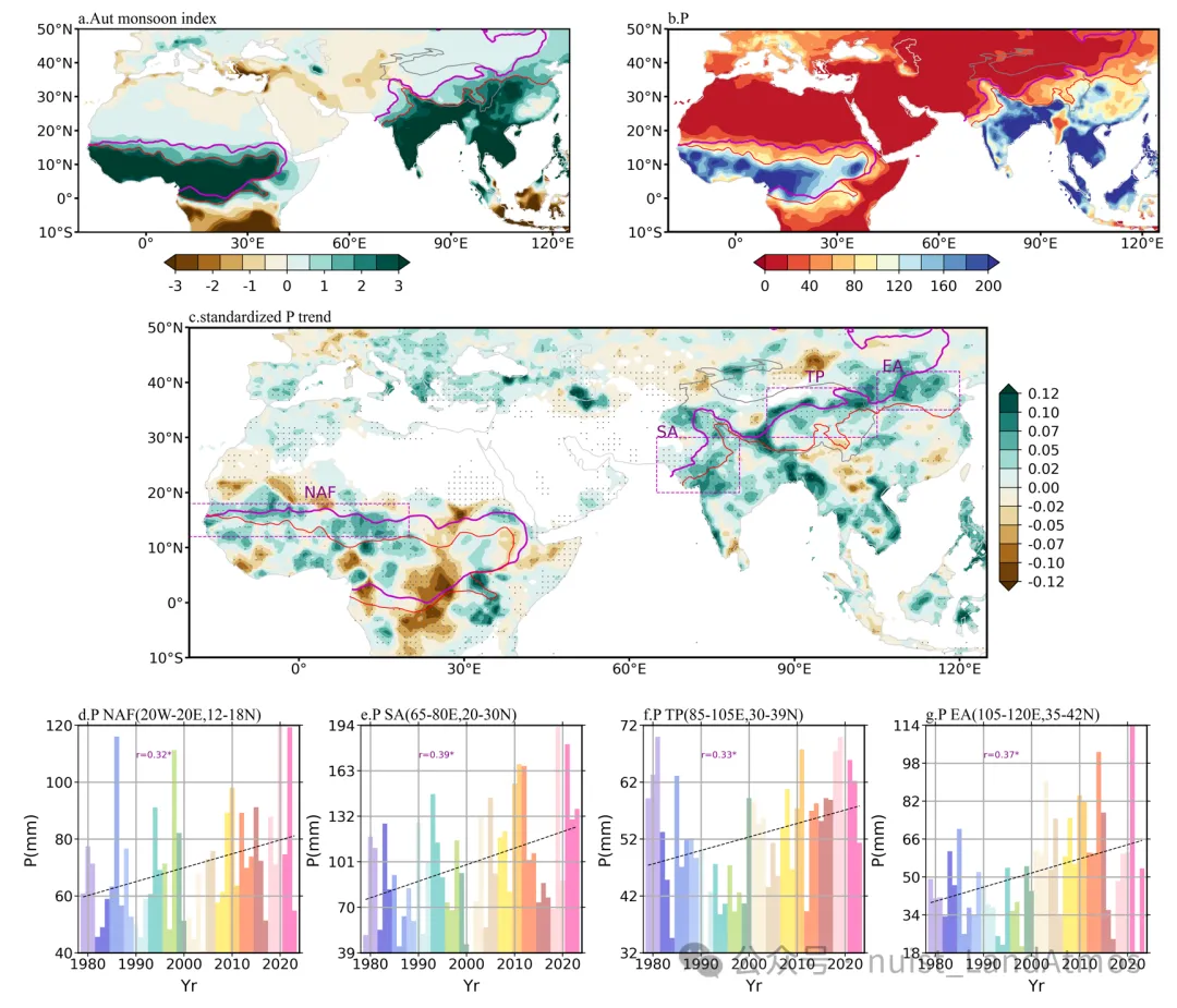 图1. 季风撤退期(9-10月)的季风指数与降水变化。(a) 季风指数(填色区域)及夏季(粗粉色线)和9-10月(细红线)季风北界。(b) 9月降水量(mm)。(c) 9月标准化降水趋势率。(d-g) 四个典型季风区北非NAF、南亚SA、青藏高原TP及东亚EA的降水量序列(柱状图,mm),灰色圆点表示90%显著性检验水平。