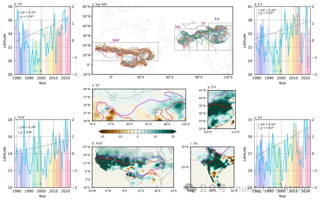 图2.1979-2024年季风北界(MSI)与9月降水变化的关系。(a) 1979-2024年9月的MSI分布。(b-e) 对应(a)中四个季风区NAF、SA、TP、EA9月MSI序列(柱状)与标准化降水指数序列(蓝线)。(f-i)标准化MSI回归的9月降水(mm),图(f-i)中粉色与红色线和灰色点同图1。