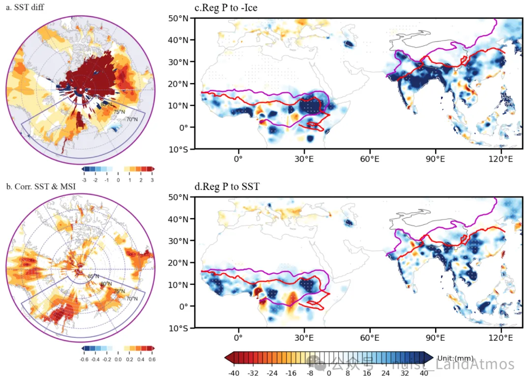 研究进一步揭示了亚非季风位置及降水与拉普捷夫海、喀拉海海冰变化存在显著关联。二者均能影响亚洲季风位置,而喀拉海区域的变化还对北非季风具有调制作用。2000年以前,偏冷的北极环境有利于单极型极地涡旋维持;2000年后,极涡结构逐渐由单极型转为偶极型。偶极型气旋分别向北大西洋-格陵兰和北太平洋方向扩展,导致格陵兰及巴芬湾上空极地涡旋减弱,形成类似负北大西洋涛动的环流模态。这一转变有助于建立极地涡旋与中纬度波列之间的遥相关联系。通过波列动力过程,华北地区易出现气旋式异常,同时日本海高压西伸,共同推动季风系统北移并增加降水。此外,从巴伦支-喀拉海至东西伯利亚海的反气旋式异常可向东延伸至东西伯利亚及东北亚,此类高纬度经向模态同样有利于北方降水增多。