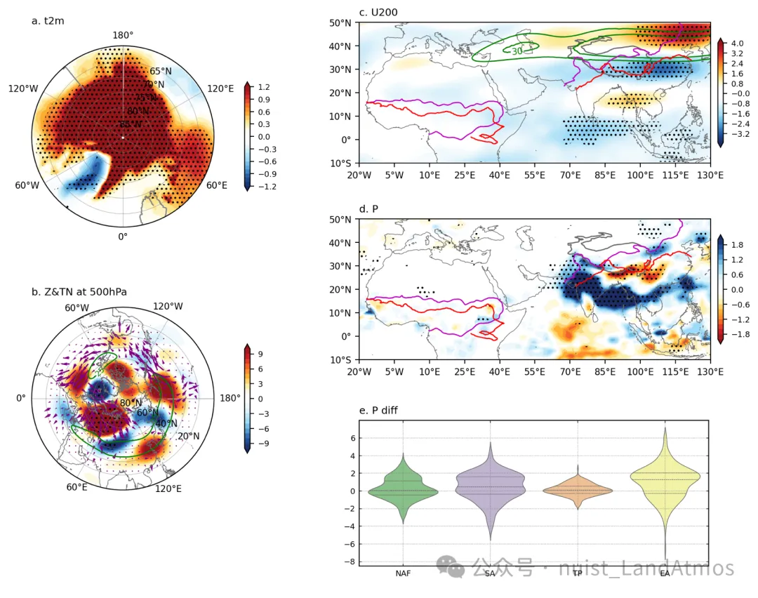 图4. PAMIP对未来与当前海冰密集度模拟的集合平均差异。(a)2米空气温度,(b)500hPa位势高度(gpm)与TN波通量(m²/s²),(c)200百帕纬向U风(m/s,(d)降水量(mm/d)。(e)来自600个模拟成员的降水量分布(mm/d)。粉色、红色线和黑色点同图1。图(b-c)中绿色线条表示20m/s与30m/s的纬向风等值线。
