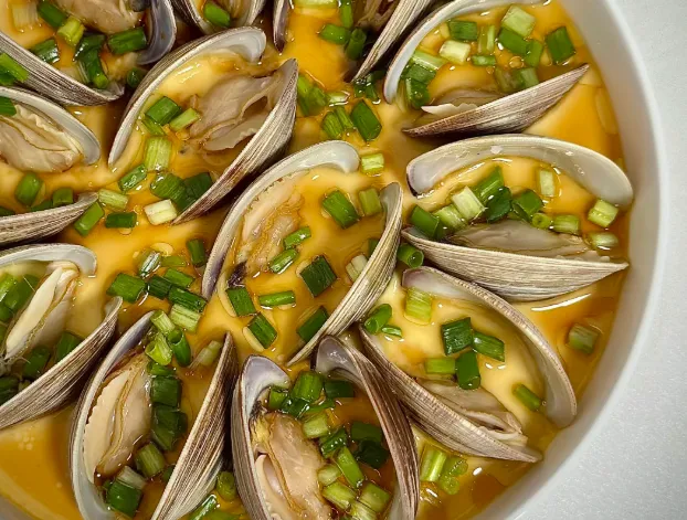 文蛤蒸蛋:这道菜极简,但极难。选最肥的文蛤,吐尽沙。蛋液打散,兑入温水,比例要精准,多一分则老,少一分则稀。文蛤开口的一瞬,鲜汁渗入蛋羹。出锅淋一点点香油和生抽,不用味精。一勺下去,嫩滑的蛋裹着鲜甜的肉,不用嚼,直接滑进喉咙,鲜得人直激灵。