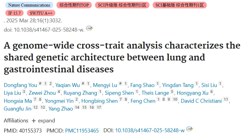 本研究整合三人群 GWAS 数据集,通过多阶段分析,明确 EUR 人群 27 对肺 - 胃肠性状的遗传相关性,筛选出 42 个多效性变异、66 个多效性基因(富集于免疫 / 炎症通路);鉴定出 3 个全新遗传位点、58 个关联基因及 3 种关联血浆蛋白;验证 4 对疾病因果关联,发现两条肠道微生物介导通路及 4 个遗传变异与环境暴露的互作效应。研究首次系统解析肠肺轴遗传机制,为肺 - 胃肠道共病精准防控提供核心依据。如果你也想借助GWAS、MR发高分SCI,欢迎后台咨询!助力你的科研产出!