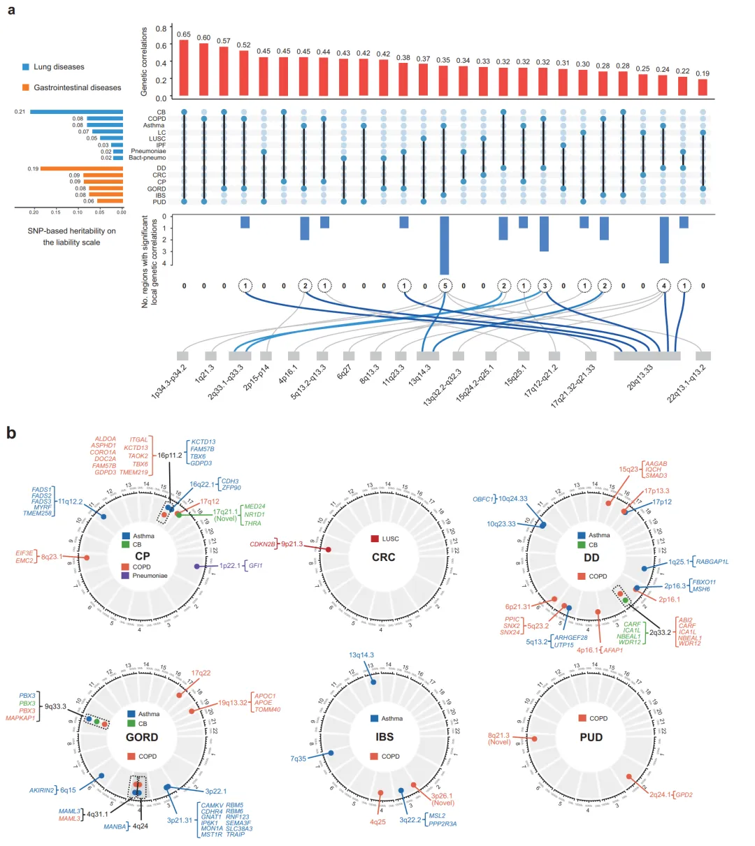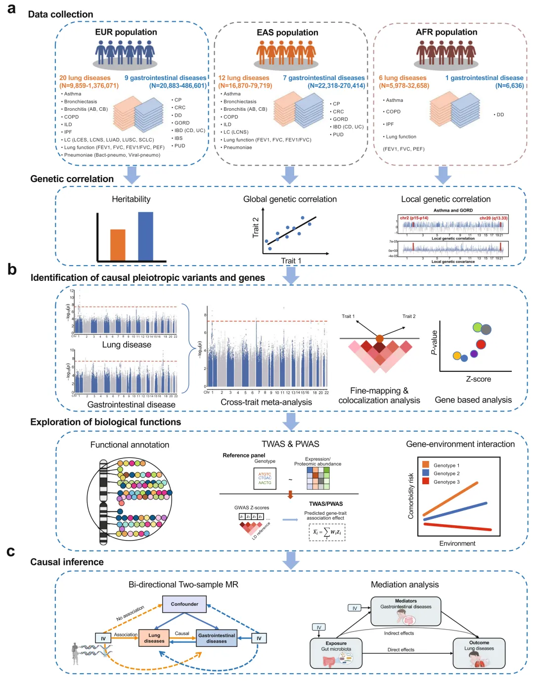 肺 - 胃肠道共病危害高于单一疾病,肠肺轴(GLA)是核心调控通路,但其综合遗传结构不明,缺乏系统性遗传机制解析。