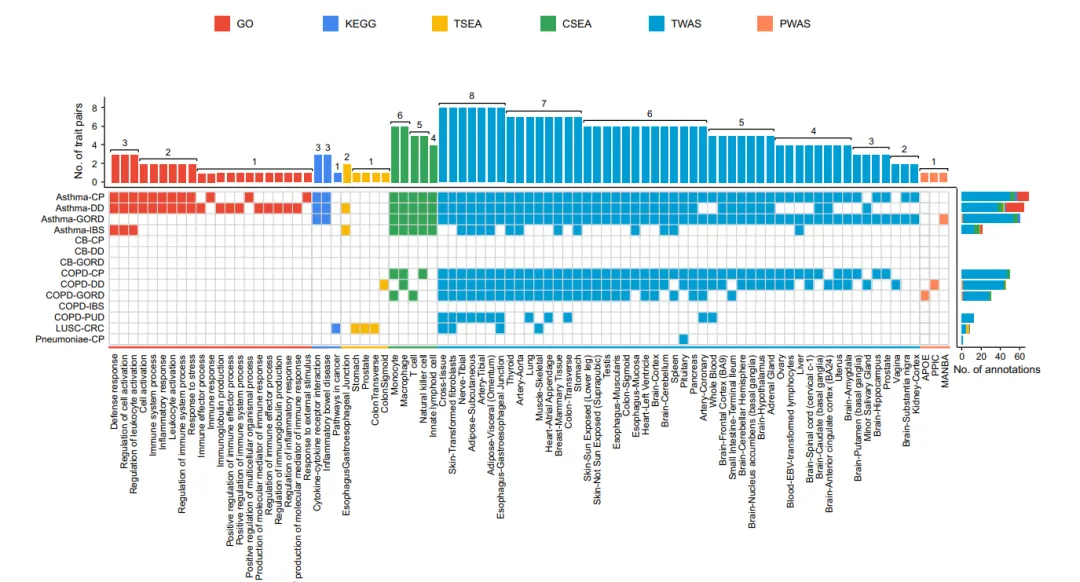 仅欧洲人群检出显著遗传关联,鉴定出27 对全局遗传相关的肺 - 胃肠道性状对,定位24 个共享局部遗传区域及 12 个功能重叠区域,区域主要富集于转录调控相关功能位点。图2:27对肺-胃肠道特征对的遗传关联总结