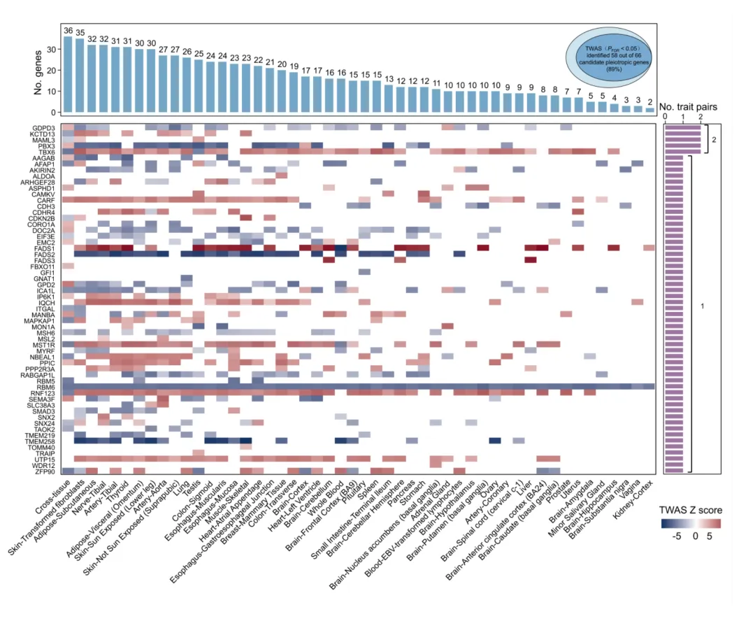 筛选得到42 个候选多效性遗传变异(含 3 个全新未报道位点),鉴定66 个多效性基因,核心富集于免疫 / 炎症反应通路,且在肺、胃肠组织及免疫细胞中特异性高表达。TWAS 分析显示58 个多效性基因表达与共病风险显著相关;PWAS 验证3 种血浆蛋白(MANBA、PPIC、APOE) 分别对应不同肺 - 胃肠道共病的发病风险。图4: 基于66个候选多效基因的TWAS分析显著关联