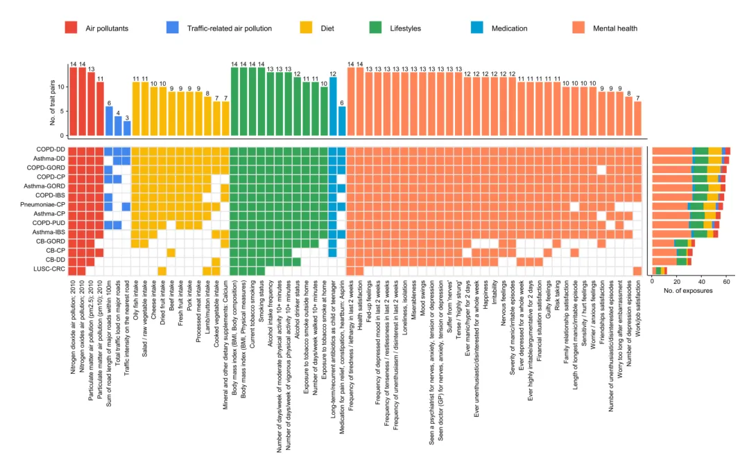 图5:UKB中64种可改变暴露因素与14种肺-胃肠道合并症之间的显著结果