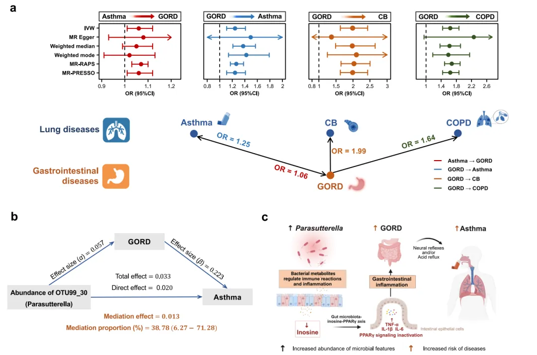 双向 MR 证实4 对疾病存在因果关联,其中哮喘与 GORD 呈双向因果;首次揭示两条肠道微生物介导通路,为肠肺轴调控提供关键证据。图6:肺部和胃肠道疾病的因果推断