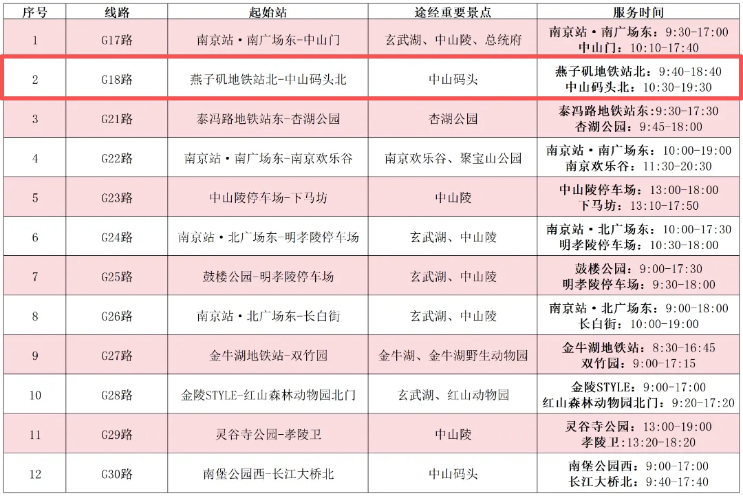 途经站点:燕子矶地铁站北、燕子矶公园、燕子矶头台洞、燕子矶二台洞、燕子矶三台洞、达摩古洞、五马渡总站、上元门、南堡公园西、下关火车主题公园、中山码头北