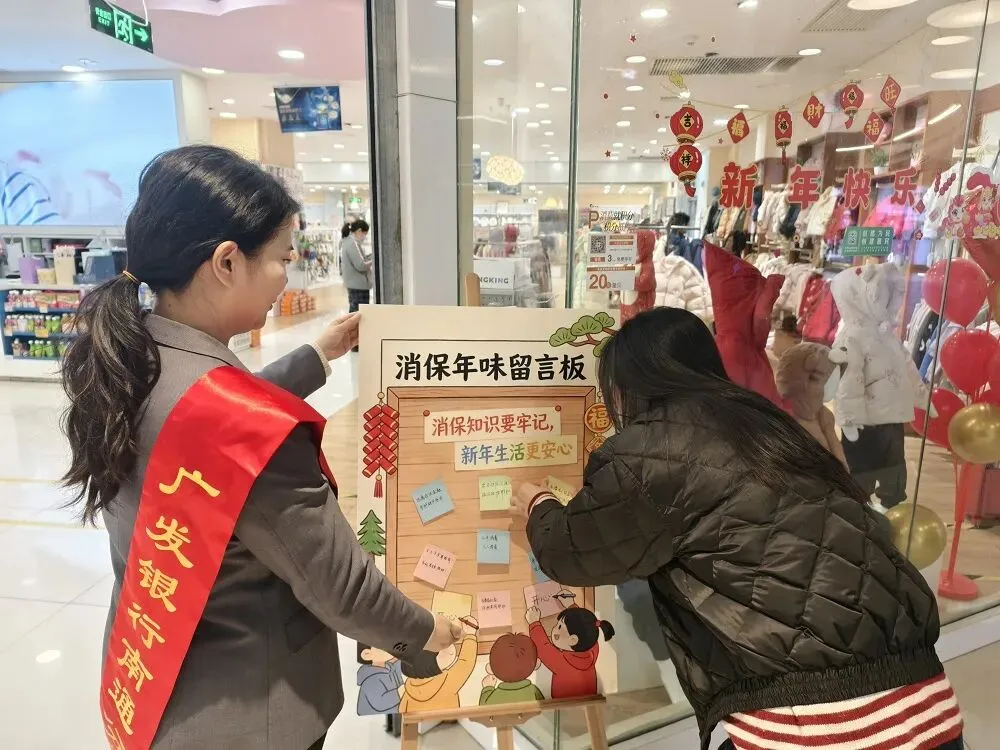 广发银行镇江分行、南通分行分别联合周边商户,打造“消保年味市集”。工作人员在市集设置消保咨询台,向商户及过往市民讲解支付安全、征信保护、非法集资危害等实用知识,并结合商户日常经营场景普及防骗技巧。在市集现场,一块充满新春趣味的“消保留言板”尤为引人注目,市民们纷纷写下“不轻信陌生来电”“保护好个人征信”“拒绝非法集资”等消保知识学习心得与温馨提示,让金融知识在浓郁的烟火气中流动传递,深入人心。