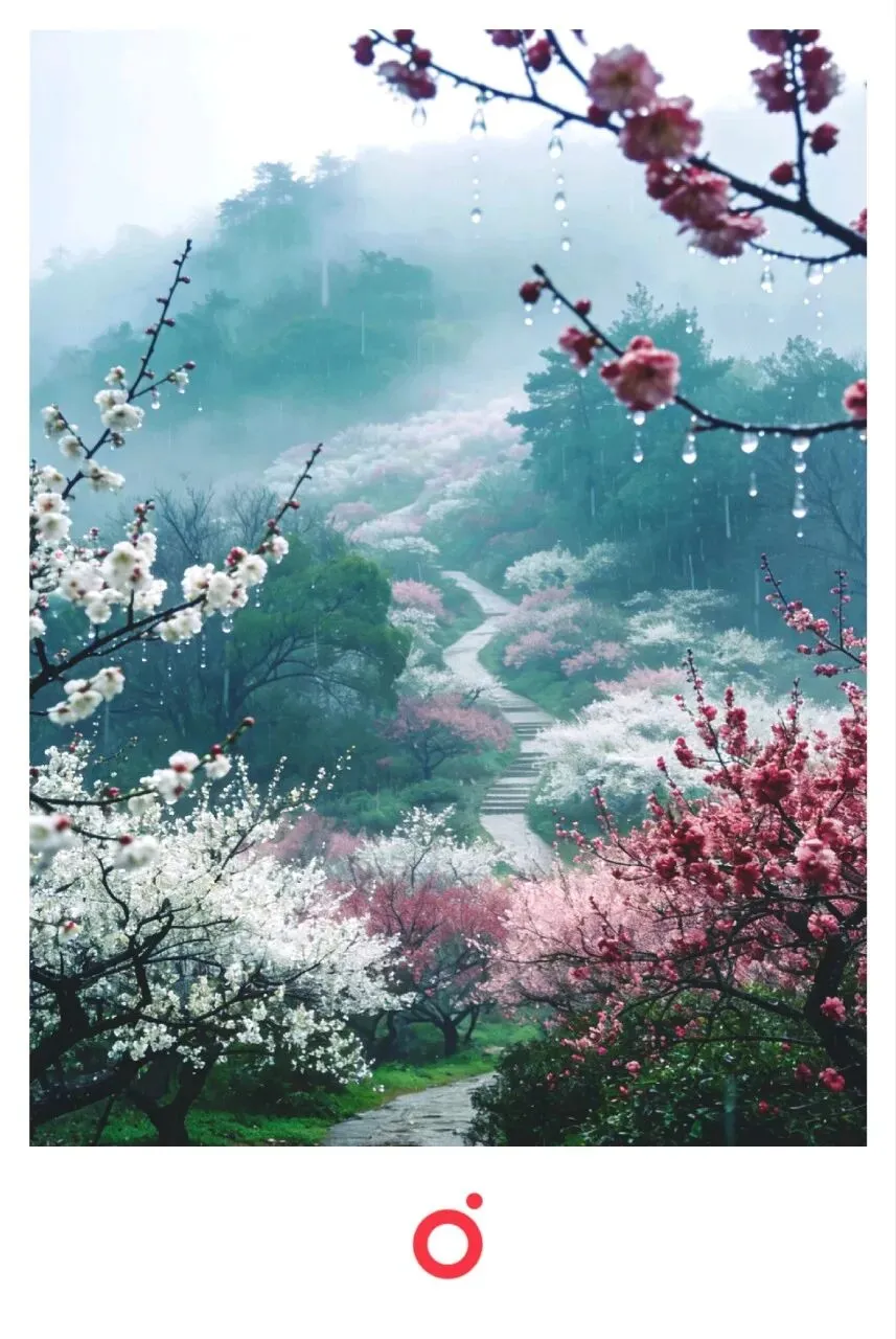 不必赶早,也不用怕人多,烟雨天的这里,反而多了一层安静的诗意。漫山梅花次第开放,白的清雅,粉的温柔,红的热烈,连空气都裹着淡淡的香。