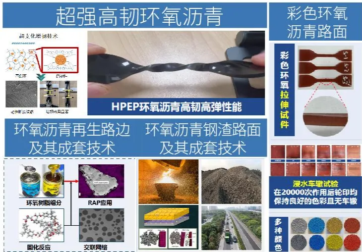 围绕低碳交通建设战略目标和长寿命交通基础设施建设需要,开展具有高强韧、抗车辙、耐疲劳、耐热性和抗腐蚀性的新型环氧材料研发及其应用技术体系研究,依托院士团队实现国产自主可控绿色生产,打破国外技术限制,拉伸强度、断裂延伸率、低温断裂延伸率等性能指标显著优于国外同类产品。相关技术已在无锡硕放机场、G25长深高速公路江苏段、京沪高速、G357上杭段等工程中试点应用。