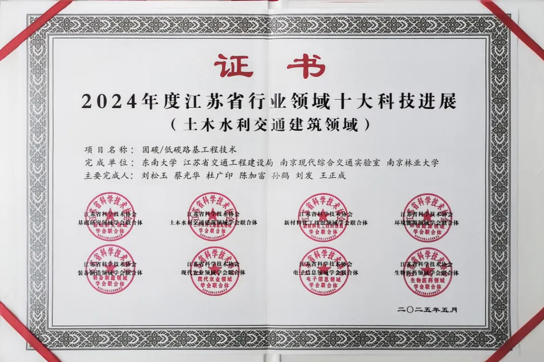 首创智能变径双向搅拌桩、固碳复合桩、整体碳化技术、低碳/固碳路基处理技术,并研发智能化施工装备,构建“低碳路基材料一创新结构设计一智能施工工艺一碳足迹核算”成套技术体系,“固碳/低碳路基工程技术”成功入选2024年度江苏省行业领域十大科技进展。相关技术已在连淮高速公路、连宿高速公路、常州-宜兴高速公路河塘淤泥处理工程、连云港海滨大道等工程中试点应用。