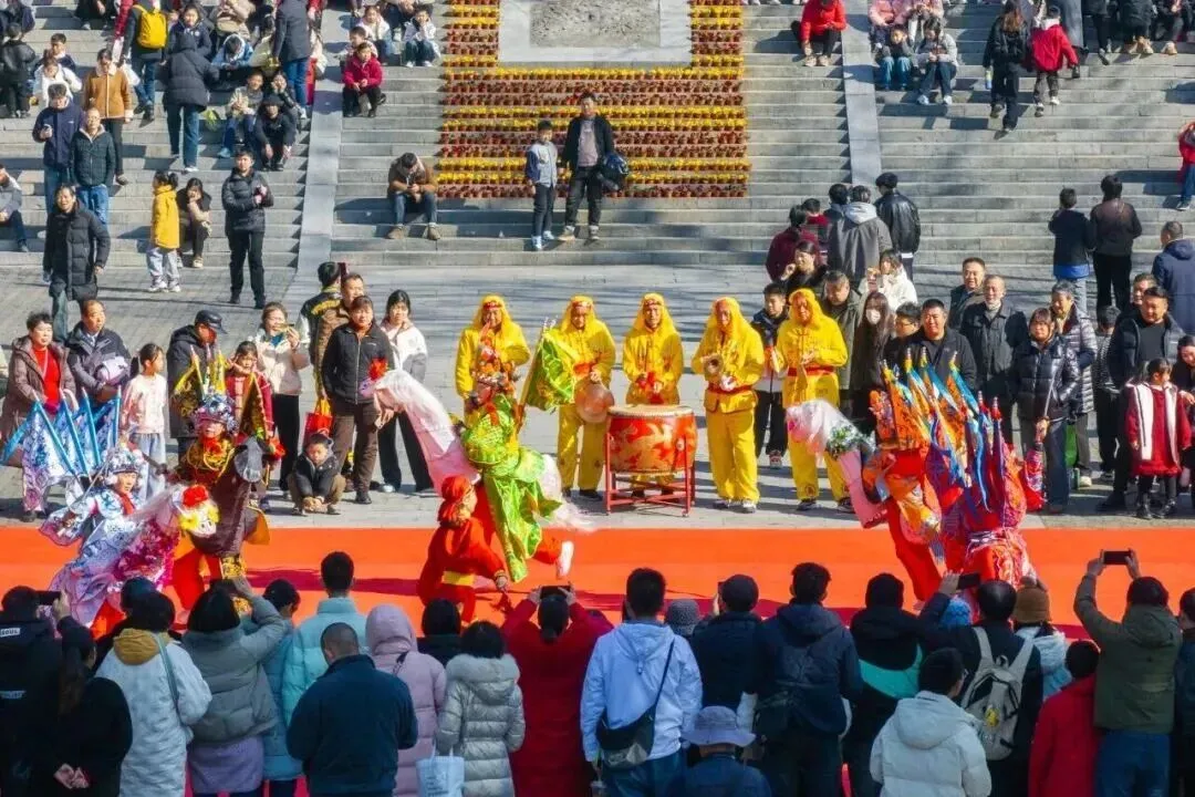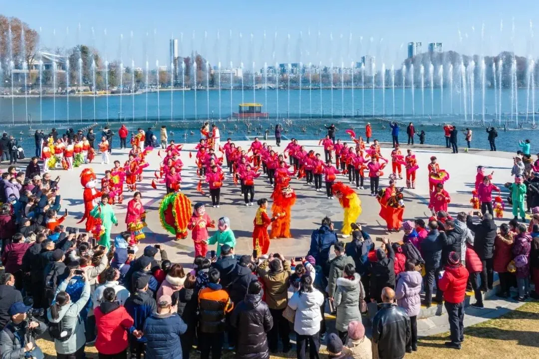 此次新春活动以“纳吉·迎福”“冬韵·雅集”“福游·顶生”三大篇章展开,祥狮献瑞、“财神”纳福、“摸牛头”等趣味互动,非遗鱼灯舞、敦煌乐舞等特色表演轮番登场,将自然盛景与人文艺术巧妙相融。