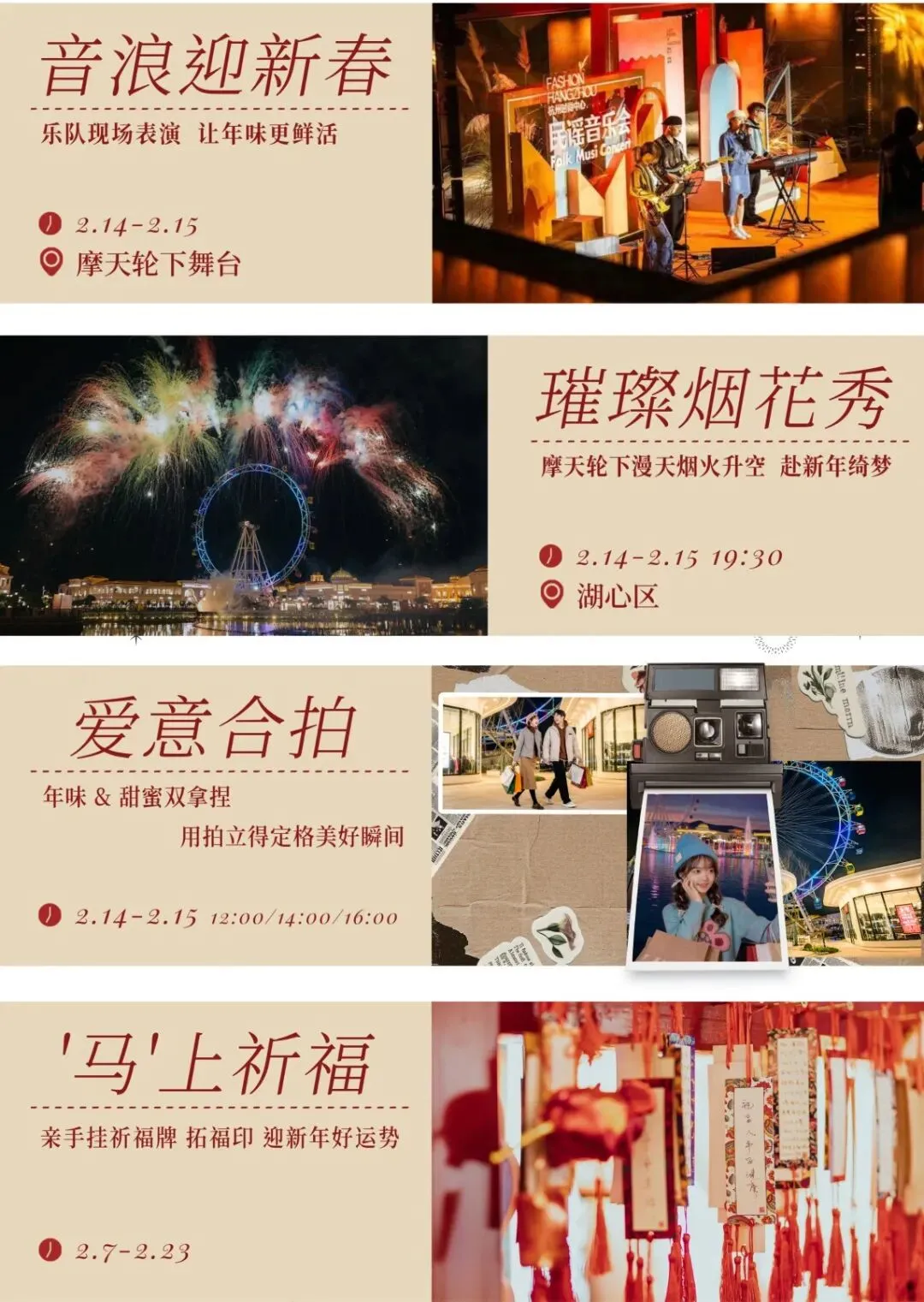 年味渐浓,浪漫升温。南京汤山百联奥莱送上!新年&情人节双份惊喜!2.14-2.15【音浪迎新春】 摩天轮下乐队现场表演;2.14-2.15 19:30【璀璨烟花秀】摩天轮下漫天烟火升空,赴新年绮梦;2.14-2.15 12:00/14:00/16:00【爱意合拍】年味&甜蜜双拿捏,用拍立得定格美好瞬间;即日起-2.23【'马'上祈福】亲手挂祈福牌、拓福印,迎新年好运势!即日起 【ARMANI】全场2折起、【COACH】精选女包1288元起、【MK】全场2折起、【KS】全场2折起!