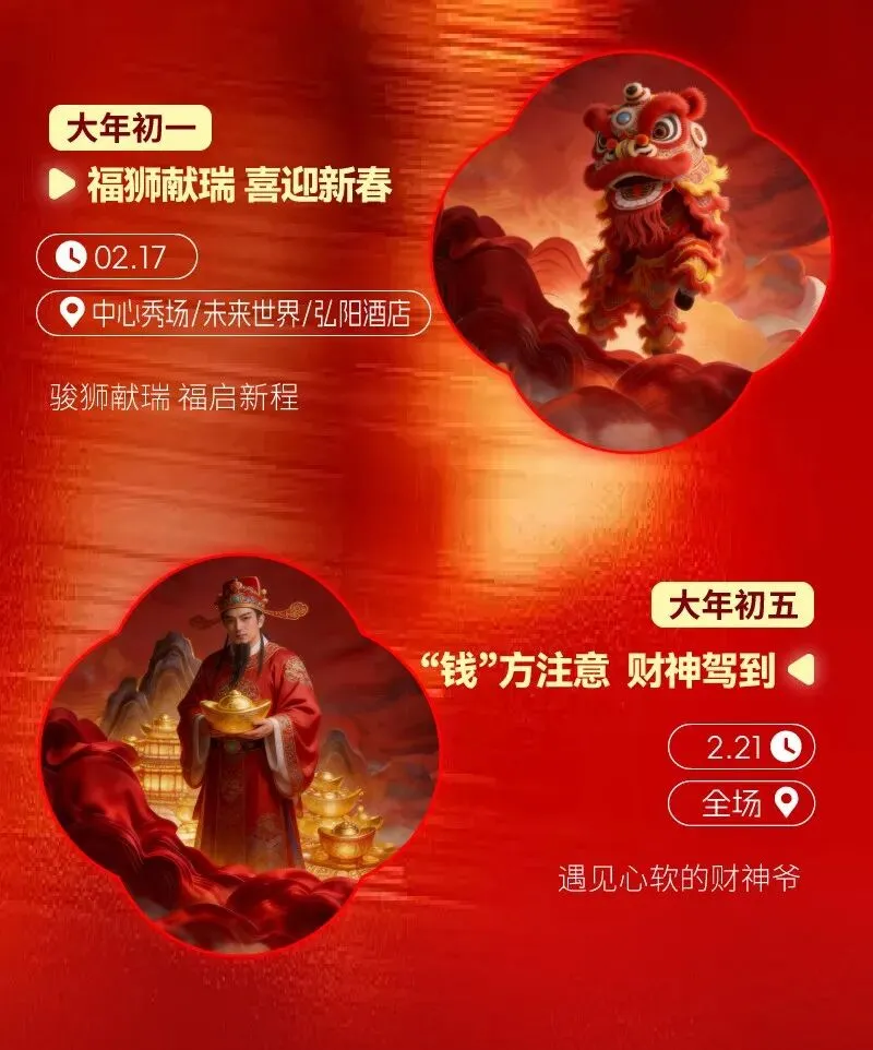 2.16(除夕) 10:00-17:00 2.17-2.23(大年初一至初七)10:00-22:00 华采天地即日起-2.28【蔡徐坤】新专辑主题痛楼打卡;即日起-2月底【邺马送春福】非遗主题灯会;即日起-3.8【梦马奇遇】新年美陈;2.14情人节【一日店长】限时营业;2.17大年初一【非遗醒狮迎新春】;2.15大年初五八方来财【迎财神】每天都有好彩头,一起跑进新春里!即日起-2.23馆内大牌零售999元升1158元、儿童零售600元升660元!2.16(除夕) 10:00-17:00 2.17起(大年初一起)10:00-22:00 21世纪太阳城即日起-2.23 上午10:00 大餐券50购100、小餐券10元购20、零售券100积分兑50零售券!即日起-2.15购物单笔消费,按摩388元赠送活鱼兑换券!2.14当天扫码加入社群即可免费领取鲜花一支或气球一个!